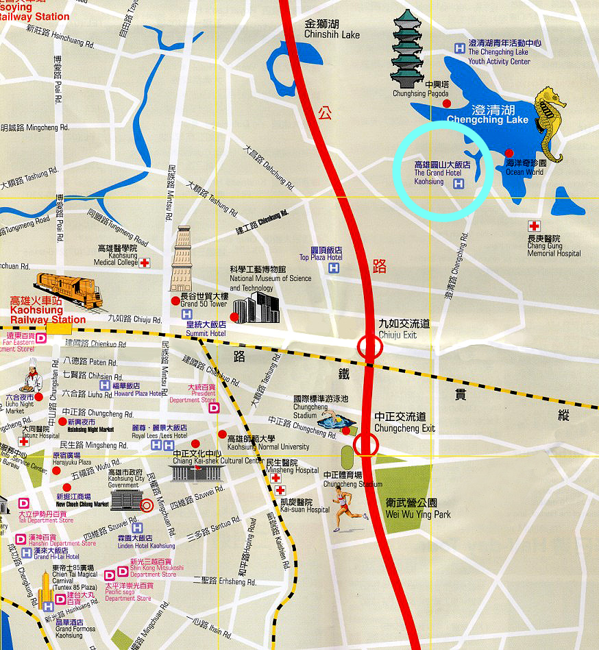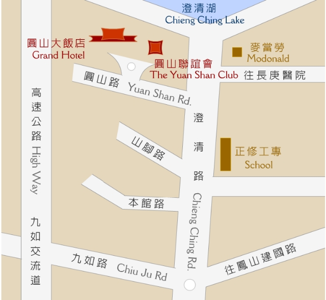 B.自行開車 高速公路南下→至九如路交流道口下→下交流道後左轉至九如路→九如路直走至澄清路左轉→澄清路直走至圓山路左轉→圓山路直走→右轉至圓山飯店。